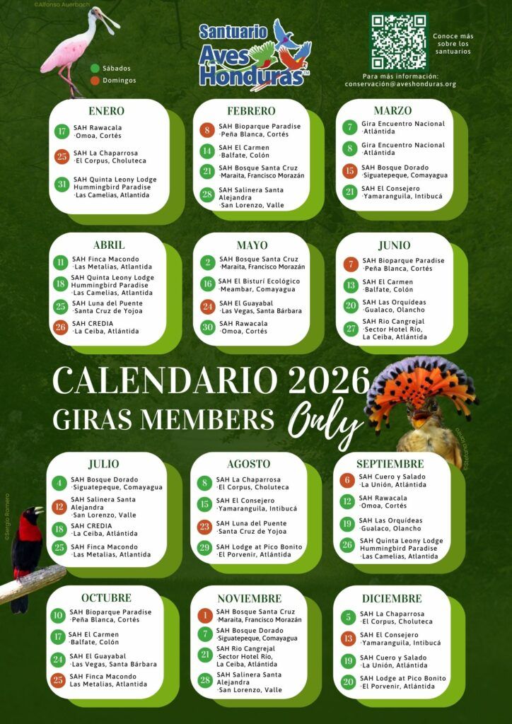 Las Giras Members Only son eventos exclusivos de observación de aves en los santuarios Aves Honduras. Participar en estas giras te permitirá deleitarte con la riqueza natural de estos maravillosos sitios, contribuir al enriquecimiento de sus inventarios de aves y disfrutar de los servicios que cada santuario ofrece. ¡Consulta nuestro calendario y vive una experiencia inolvidable!