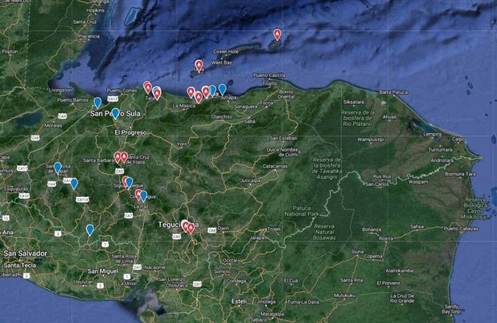Figura 1. Mapa de distribución de las listas generadas en el marco del Honduran Big Day 2023 (Fuente: eBird.org). Marcadores rojos son sitios de interés para la observación de aves en eBird (hotspots) y marcadores azules son localidades personales en eBird.