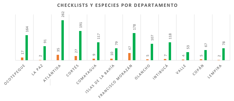 Los registros del Reporte de Viaje generado por eBird, indican que un total de 170 listados fueron enviados durante el Honduran Big Day 2026 y fueron provenientes de 12 departamentos. Existe una relación entre checklists y número de especies registradas, algo que se relaciona con el esfuerzo de muestreo en términos de sitios explorados. Los departamentos con mayor cantidad de checklists enviados son Francisco Morazán con 45, Atlántida con 35 y Cortés con 25. Ahora bien, Atlántida es el departamento con mayor número de especies registradas con 262, seguido de Cortés con 191, Francisco Morazán con 178 y Ocotepeque con 164 especies de aves. En el siguiente gráfico podrás ver el número checklists (color naranja) y especies registrados por departamento (en verde).