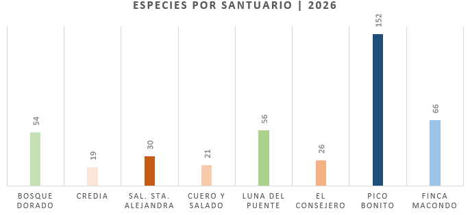 Por su parte, hubo registros en 8 de los 18 Santuarios Aves Honduras, haz clic en el nombre del Santuario para ver el checklist generado. Los Santuarios con actividad fueron: el Centro Regional de Documentación e Interpretación Ambiental (CREDIA) en La Ceiba, Bosque Dorado Nature Lodge en Siguatepeque, Salinera Santa Alejandra en San Lorenzo, Refugio de Vida Silvestre Cuero y Salado en el Norte, Luna del Puente en la región del Lago de Yojoa, El Consejero en Yamaranguila, Pico Bonito Lodge en el Norte y Finca Macondo en Las Metalias.