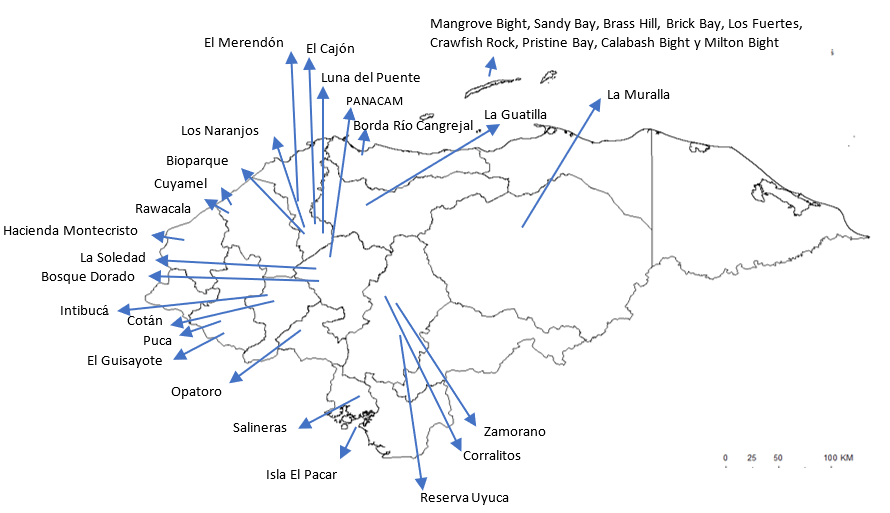 El siguiente mapa muestra los sitios que fueron explorados con el apoyo de Aves Honduras en todo el territorio nacional. Nota: Muchos otros sitios que no aparecen en este mapa también fueron visitados y sus registros forman parte de los resultados del HBD. Las giras de observación y registro de aves fueron realizadas por: Clubes de observación de aves y/o miembros de Aves Honduras.