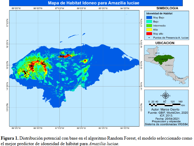 Los resultados indican que Random Forest es el mejor modelo, encontrándose que: Lempira, Cortés, Santa Bárbara, Olancho, y Yoro son las zonas predichas con idoneidad muy alta, donde ya se ha registrado la especie. Comayagua, con idoneidad muy alta y Copán e Intibucá con idoneidad alta, son zonas donde no se ha registrado A. luciae. Se encontró que la variable bioclimática más importante fue la precipitación del trimestre más cálido.