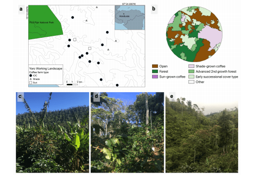 (a) Ubicaciones del sitio de estudio, (b) paisaje local de 250 m de radio con tipos de cobertura presentes en el paisaje de trabajo, (c) finca de café de sol, (d) finca de café de sombra, (e) finca de conservación de tierras (IOC) con café de sol y bosque adyacente en la misma finca.